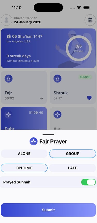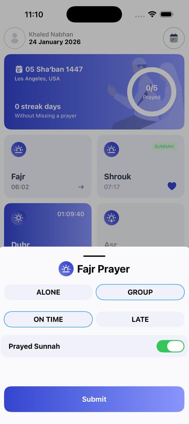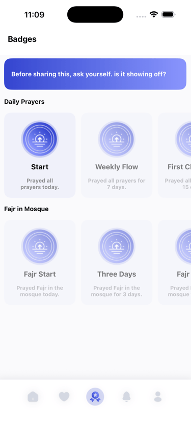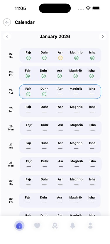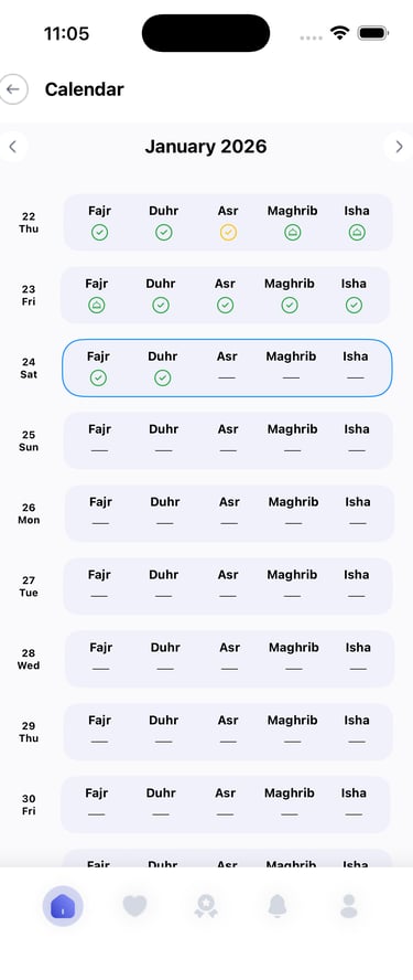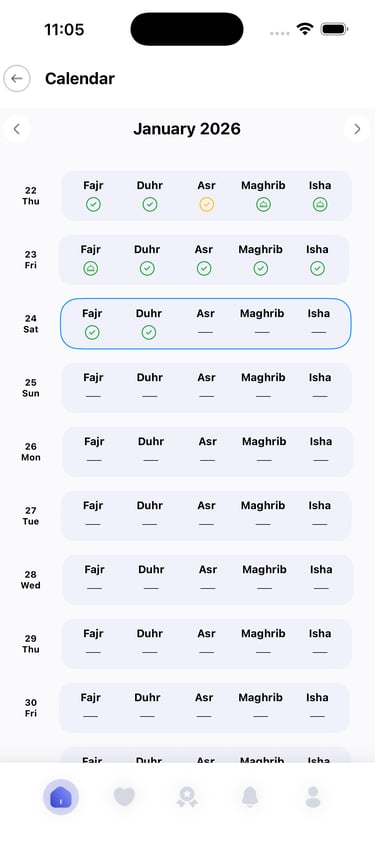 Monitor your progress with an interactive calendar and a heat map of your prayer habits. The more consistent you are, the more badges you earn as personal rewards—motivate yourself to reach new milestones and build a stronger routine!